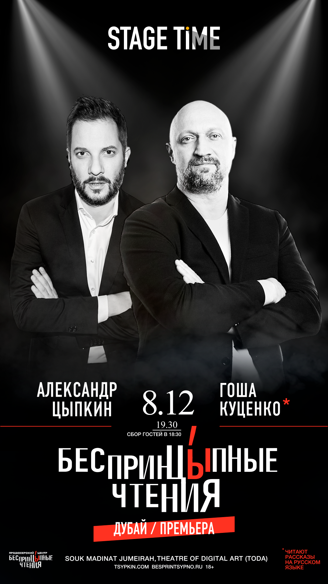 8 декабря автор бестселлеров, один из основатель нашумевшего литературно-театрального проекта «БеспринцЫпные чтения» Александр Цыпкин вместе с ведущим российским актером театра и кино Гошей Куценко впервые выступят в Дубае.